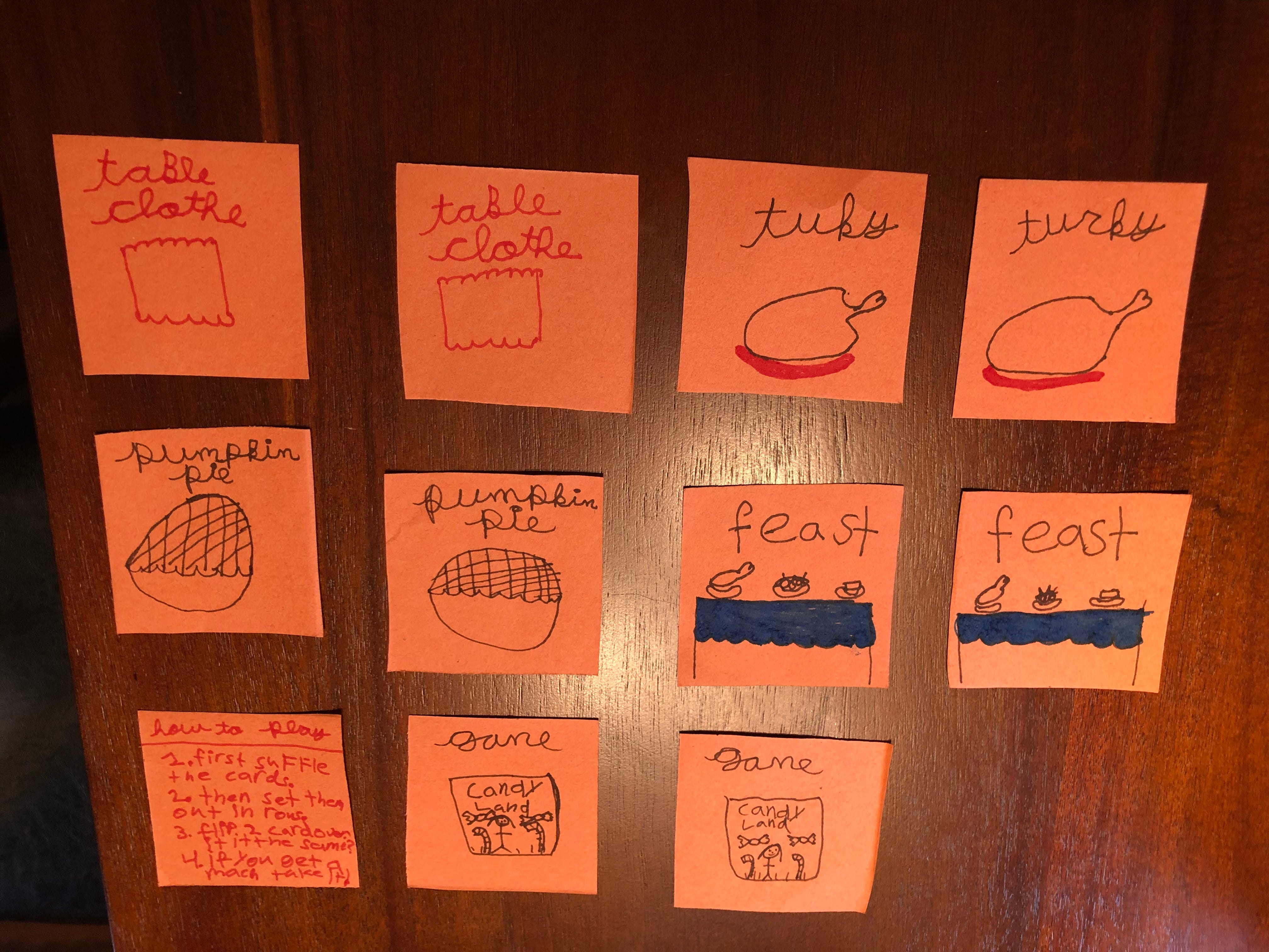 When I think of Thanksgiving, I also think of playing family games. Make a memory game by taking cardstock or construction paper (make sure the paper is dark enough that you can’t see through it) and cut squares that are exactly the same size. Use a ruler and give your child some measurement practice to make all of the squares the same size.